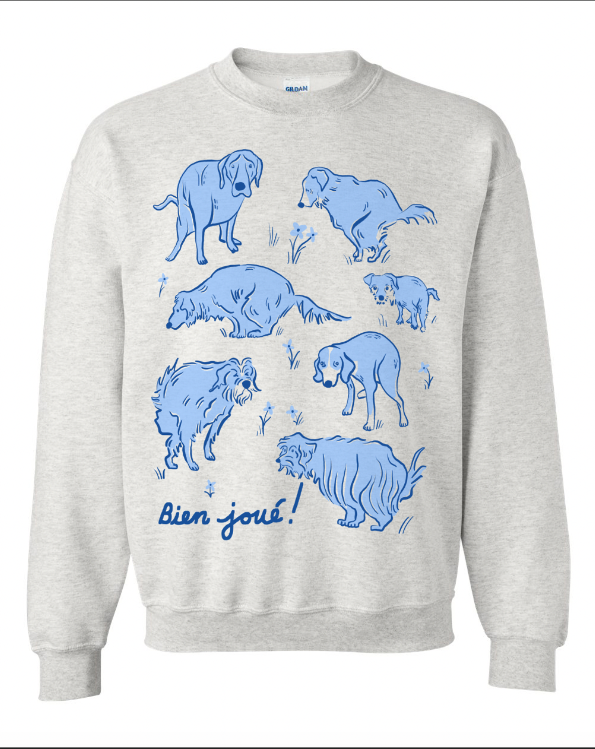 This cozy grey crewneck sweatshirt features adorable illustrations of dogs caught in the act, doing what they do best: pooping. Each dog is captured in its own hilarious pose, from the look of concentration to the casual squat.