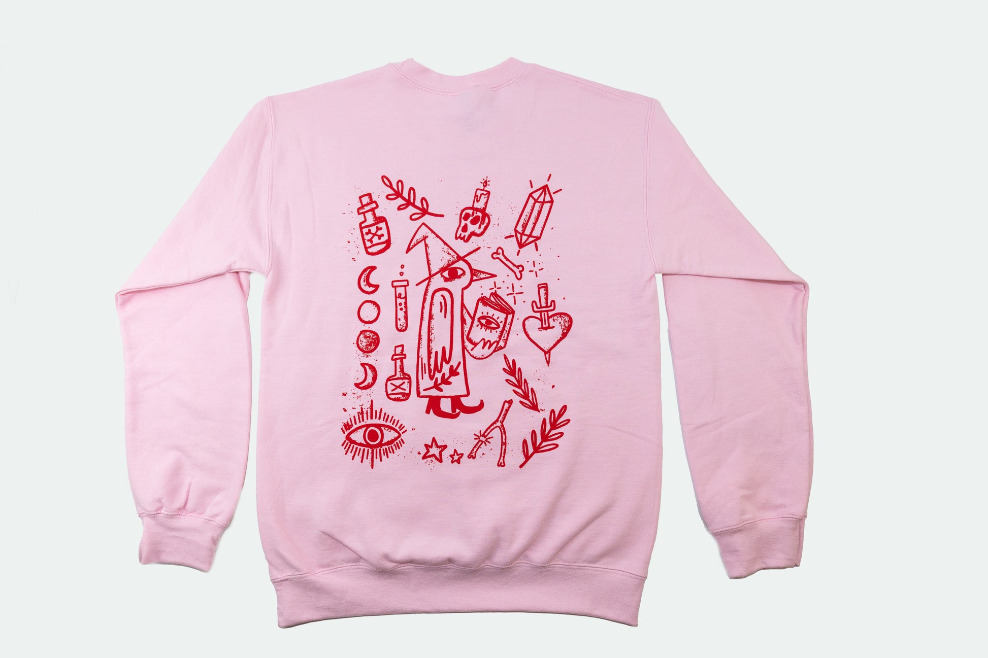 Printed on a UNISEX light pink 50/50 Poly/Cotton crewneck sweatshirt.