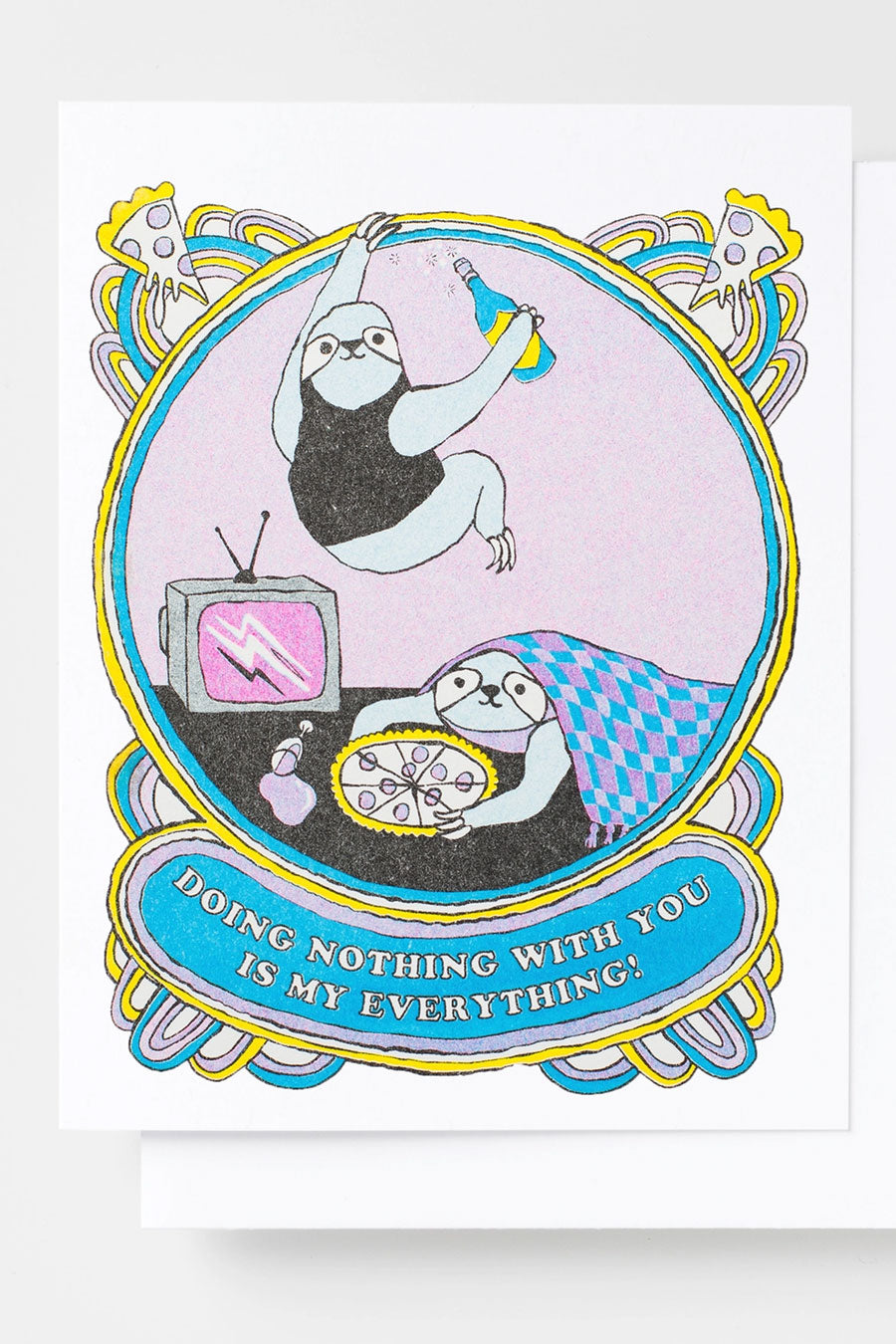 Risograph is what you would get if a screen print and a mimeograph had a baby; images are printed one color at a time and colors are layered on top of each other making each card unique. The vivid colors and playful imagery are sure to brighten anyone's day! Printed in San Francisco with veggie-based inks on 100% PCW recycled paper. Each card is 4.25" x 5.25" (16 x 11 cm) and blank inside.