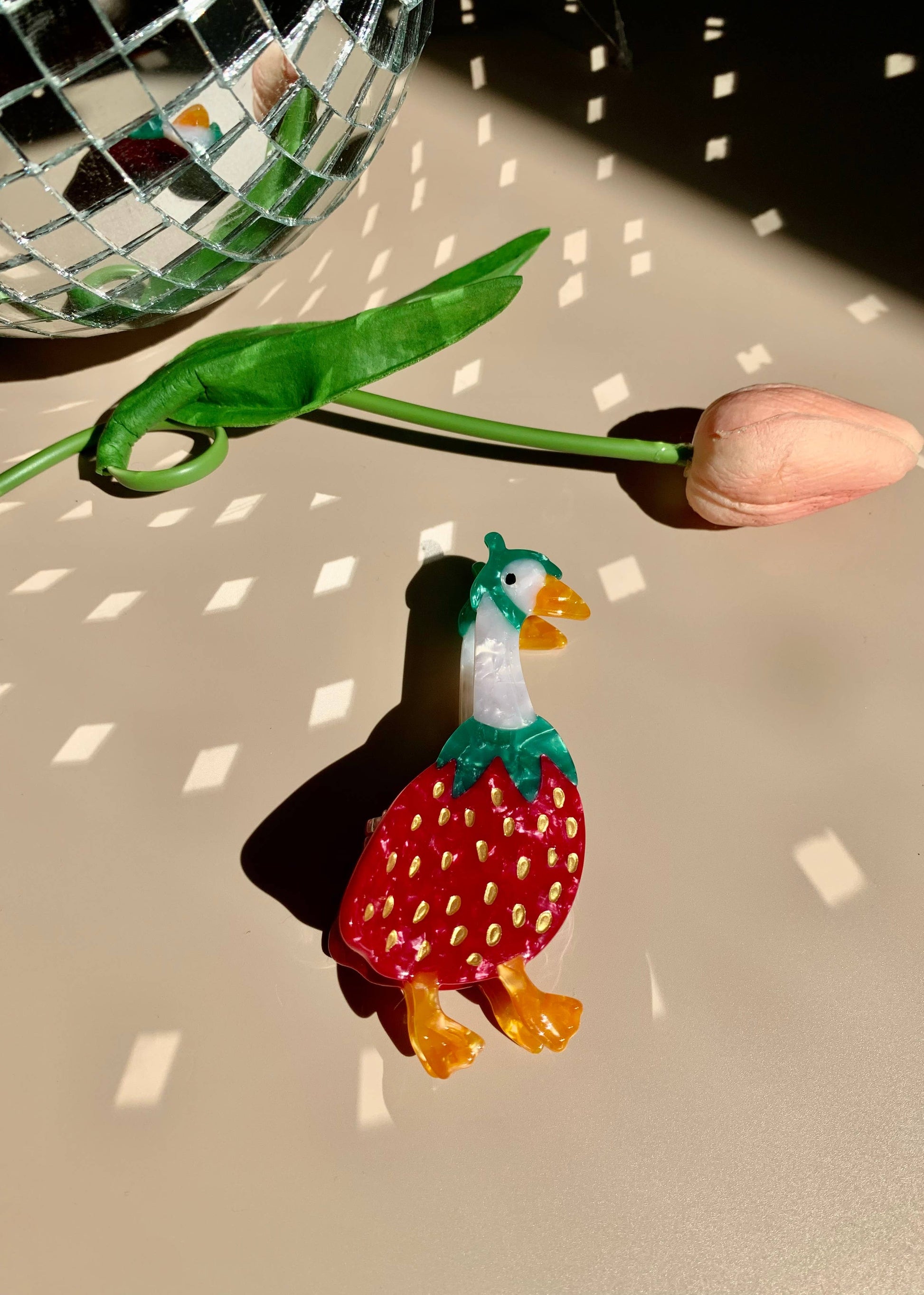 You can now wear our most popular porch goose character in your hair! These durable hair clips are made from acetate. They are perfect for spicing up any outfit. They are almost 4 inches long and 1.75 inches wide. These hair clips were designed by us and manufactured in China.