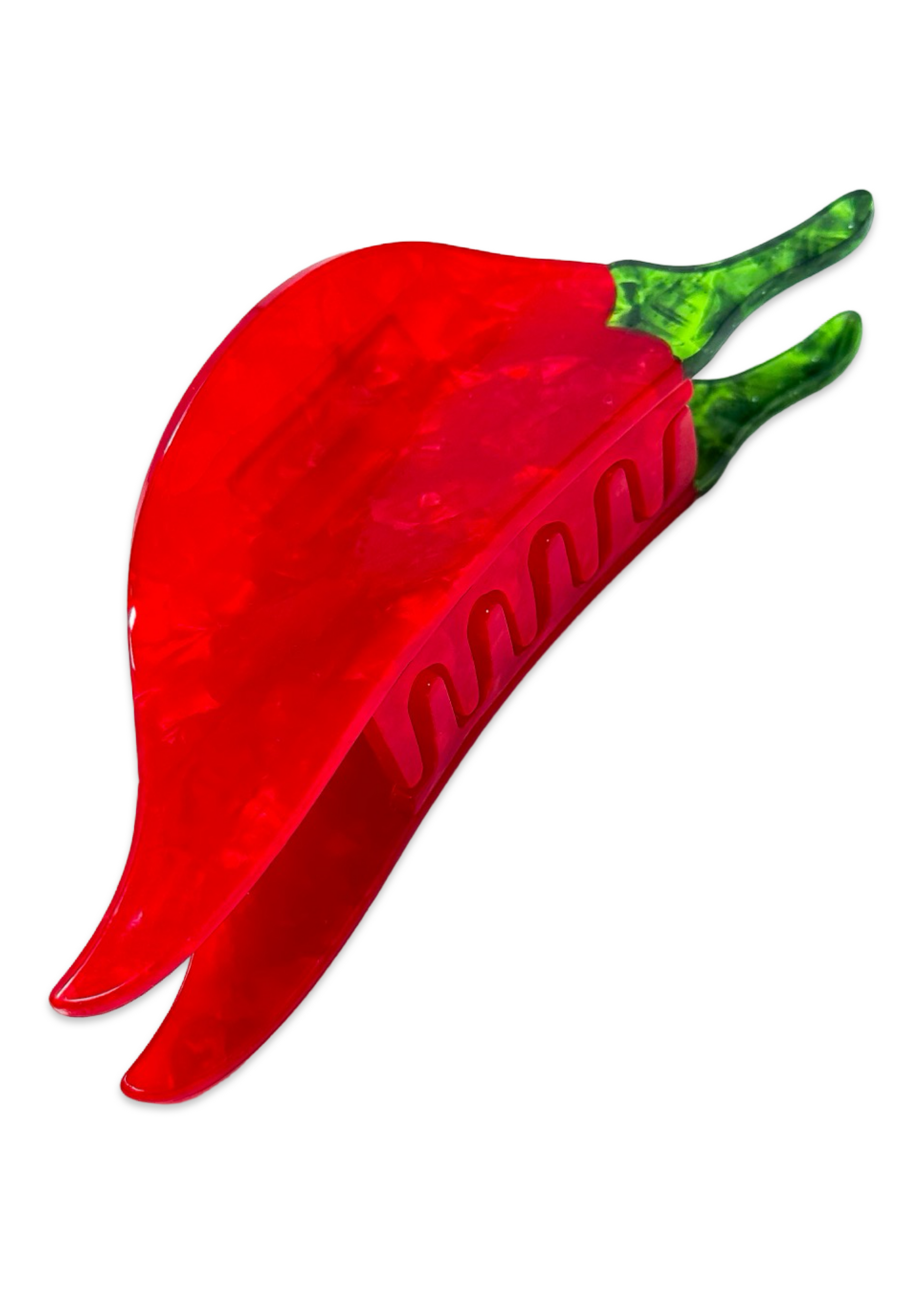 Add some spice to your style with our Chili Pepper Hair Claw, crafted from cellulose acetate—a planet-friendly alternative to plastic. Created in collaboration with Dreasdoodles, this accessory measures 4" x 1.25" and features unique color variations. Handmade by skilled artisans, it’s a fun, eco-conscious choice for your hair routine.