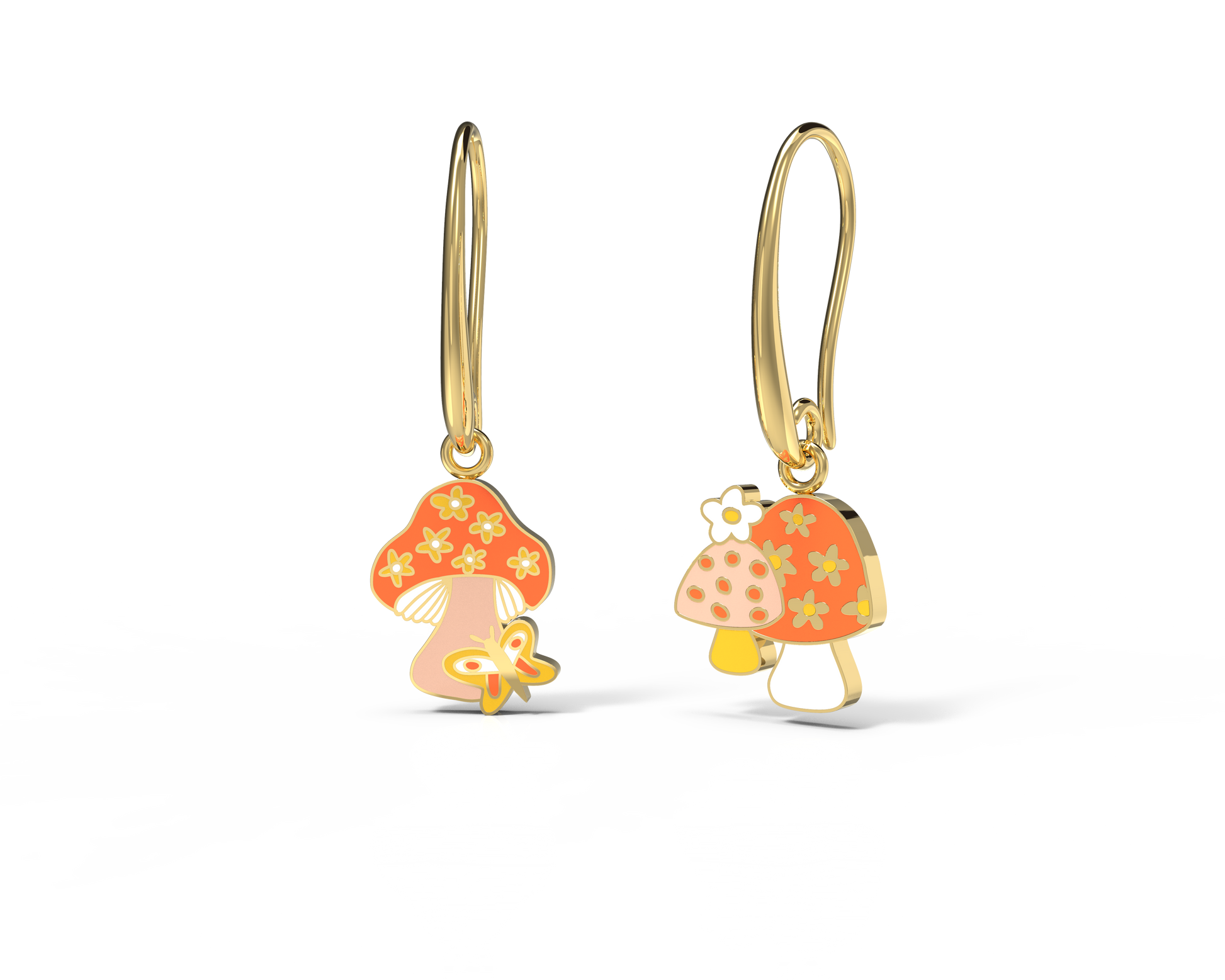 Mushroom Butterfly Earrings - Gold Psychedelic 70s Jewelry