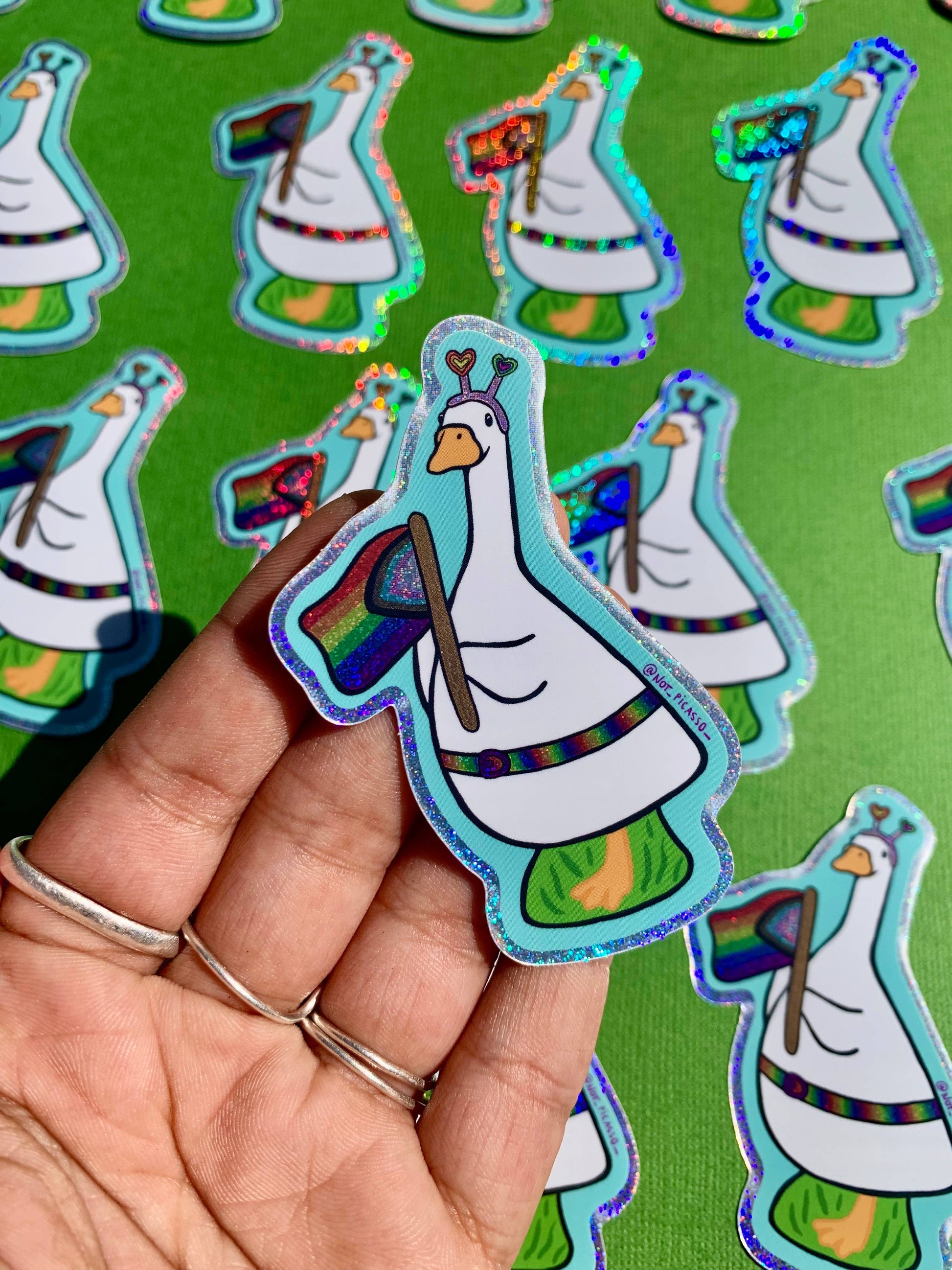 Show your pride with this pride goose sticker. Inspired by the classic Midwestern porch ornament, this goose is proudly showing support for the lgbtq+ community with a pride flag.