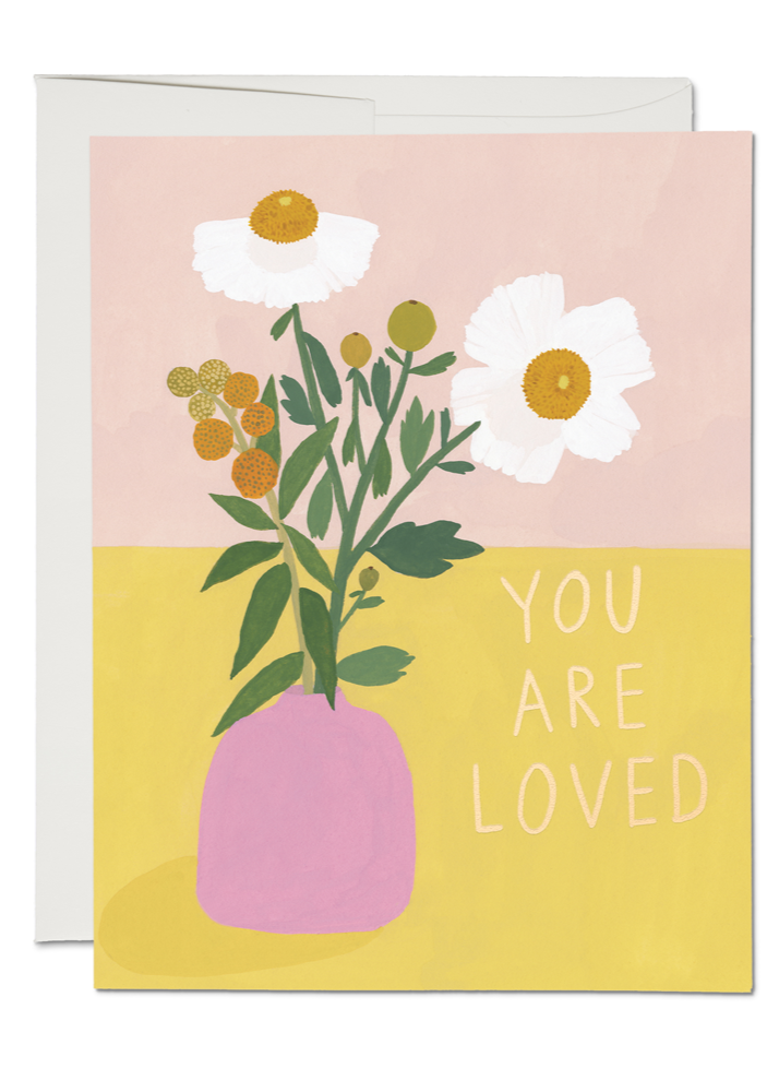 Blank inside. 100lb heavyweight card stock. Offset printed and foil stamped. 5.5 x 4.25 inches. Illustrated by Kate Pugsley. Printed by Red Cap Cards in Los Angeles, California, USA, on recycled paper.